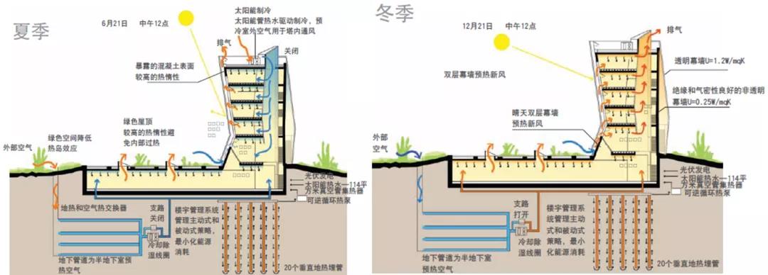 淺層地熱能,空氣源熱泵、深層地熱源在建筑上的應用都屬于“低品質的能源”,因為這些能源最高溫度往往都是在100攝氏度上下,而高品質能源例如電能是可以長距離輸送和高效轉換的能源。這些高品質能源一旦與峰電交易、碳交易相結合,就可以為用戶帶來足量的現金流。建筑物產生的綠色電力可以高效轉化為其它類別的能源,這樣的高品質能源不僅可以長距離輸送,也可以很方便的儲存。低品質能源可在建筑內作為制冷或供暖充分應用,而高品質能源則可以作為電網的調峰能源適時交易出售。如果每一個建筑都能實現碳中和,那么整個城市碳中和就能順理成章地完成。總的來說,在“建筑結構”的革命上,首先應該考慮盡可能充分利用就地產生的低品質能源,輸出和交易高品質能源。除此之外,“碳中和建筑”必然也是一種氣候適應性建筑,這就要求“碳中和建筑”需像鳥的羽毛一樣,根據自然氣候進行自適應調節變化。