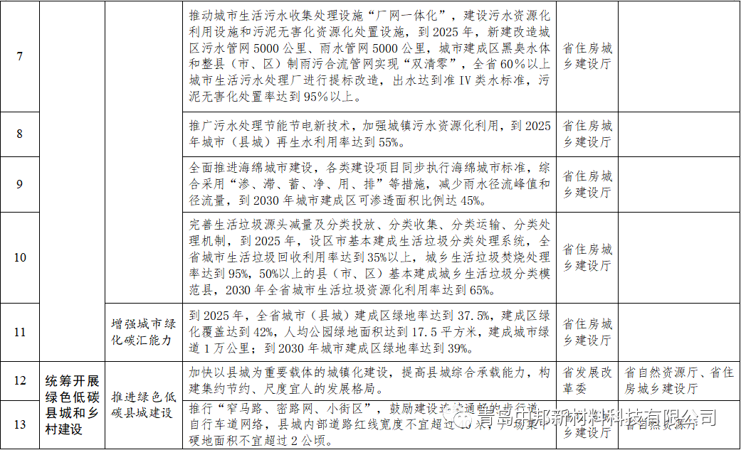 。優化城市綠化植物碳匯結構,用近自然、群落式、低維護、可持續的方式營造城市生態空間,提升城市綠地固碳增匯效能,科學構建園林綠化廢棄物循環利用體系。加強城市綠化養護運維,科學選用綠化方式和綠植種類,優先選用本地苗木,推廣節水型低成本維護園林綠地。到2025年,全省城市(縣城)建成區綠地率達到37.5%,建成區綠化覆蓋達到42%,人均公園綠地面積達到17.5平方米,建成城市綠道1萬公里;到2030年,城市建成區綠地率達到39%。