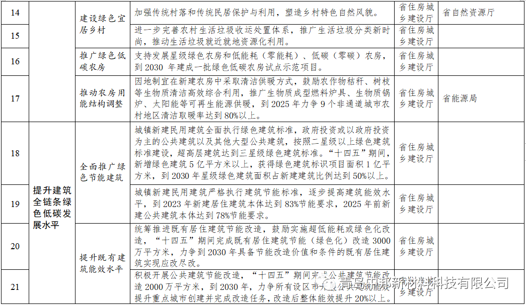 積極推廣農房設計、建造綠色低碳技術產品,推動政府投資的農村公共建筑、各類示范村鎮農房建設項目率先執行建筑節能及綠色建筑標準,鼓勵結合清潔取暖改造同步實施既有農房節能(綠色化)改造,支持發展星級綠色農房和低能耗(零能耗)、低碳(零碳)農房,到